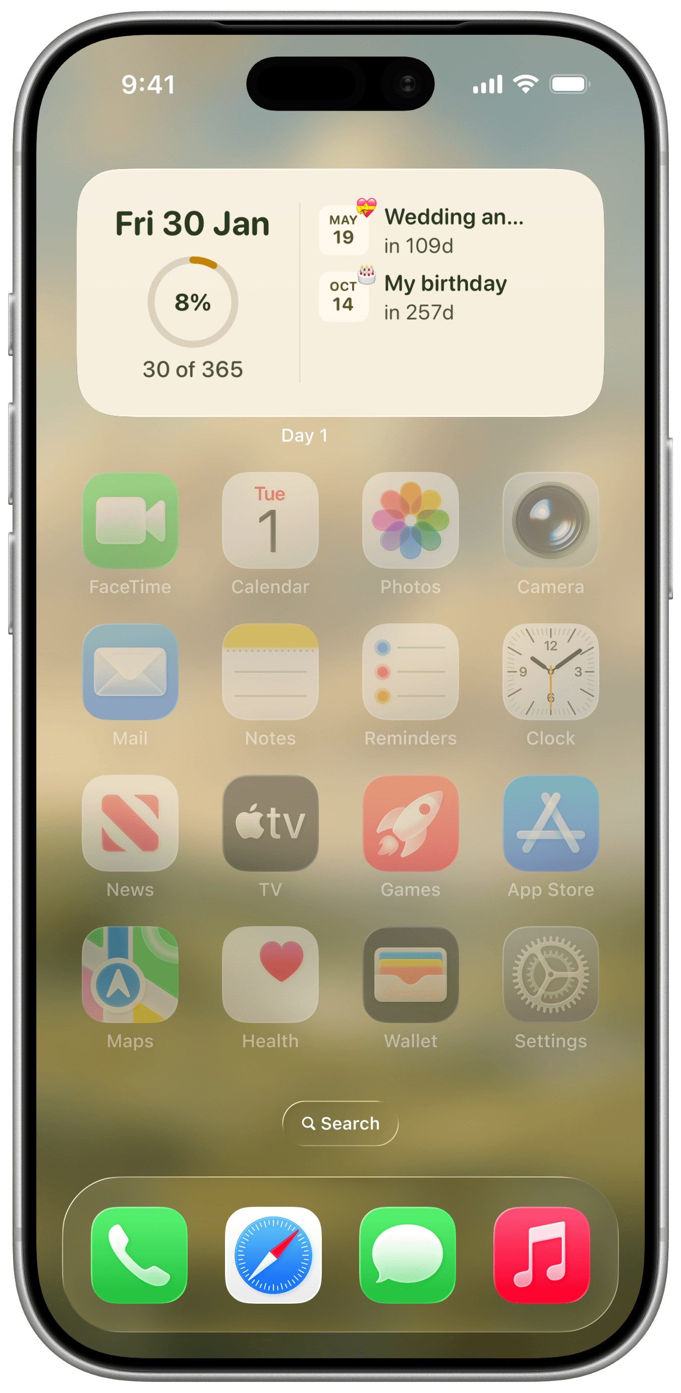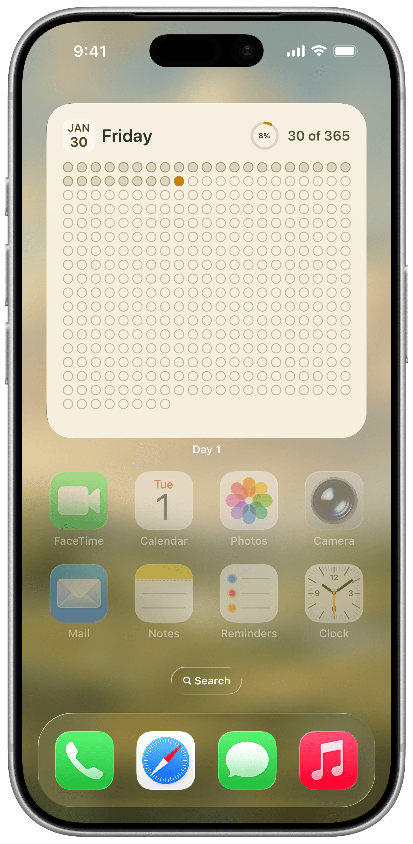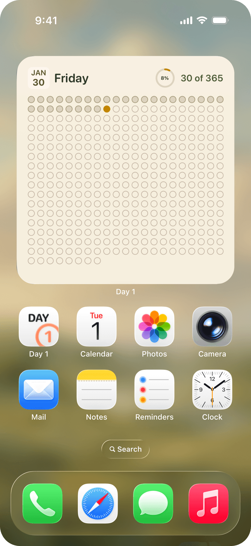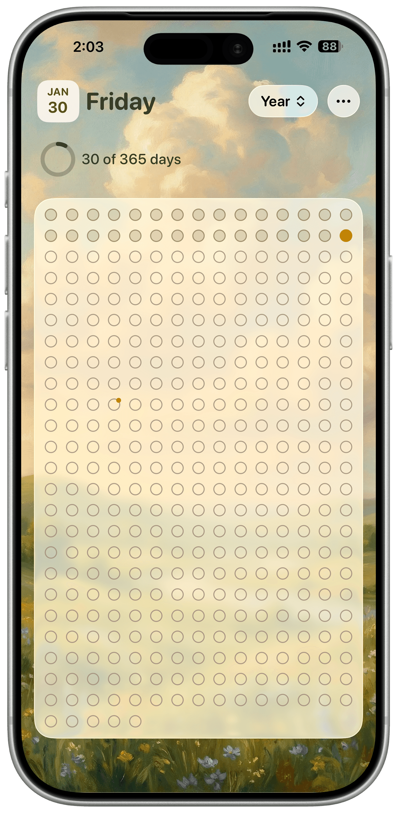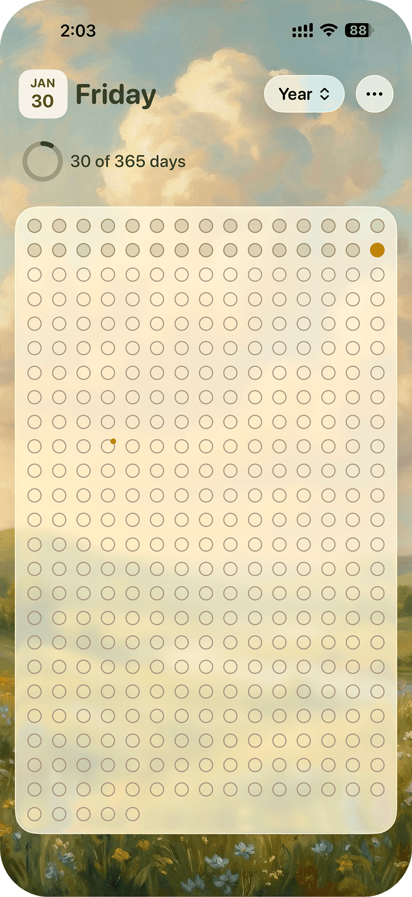DayOne transforms your year into a stunning visual map. Track the days that matter, mark your moments, and see your entire year unfold at a glance.